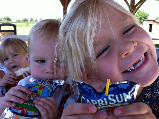 ~ Picnic at the park. Baby is not drinking but actually blowing the container up so she can blow the air at me. . .